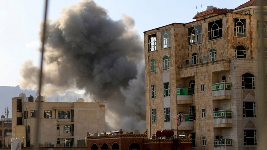 这是9月25日在也门首都萨那拍摄的以军空袭产生的浓烟。 新华社发