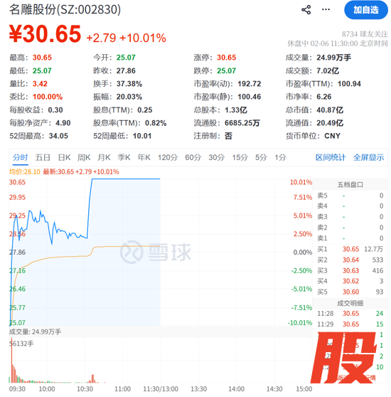 截至午间收盘,名雕股份仍保持涨停状态,报30.65元/股;半日成交额超7亿元,买一超12万手。